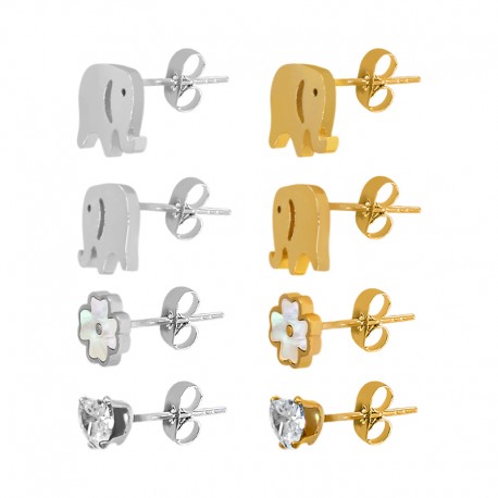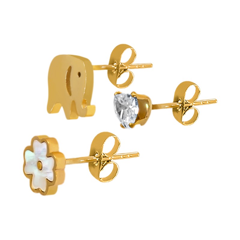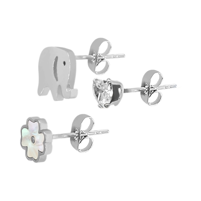 Pendientes de Acero Inoxidable 304 Elefante,Corazon y Flor (set 3)